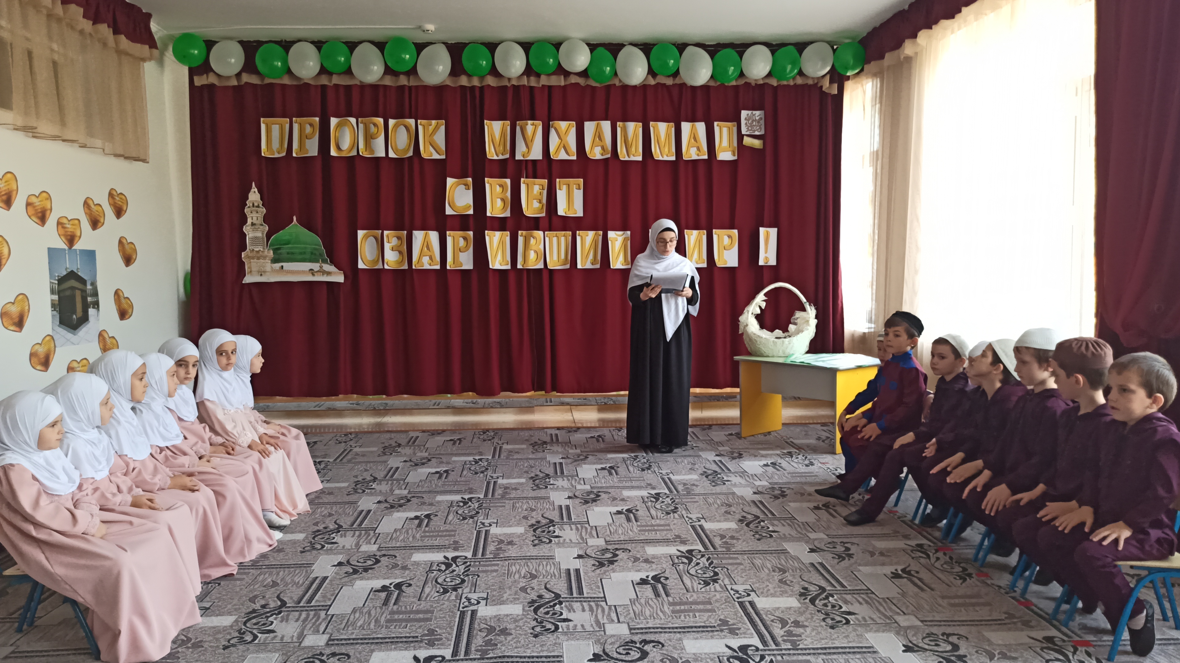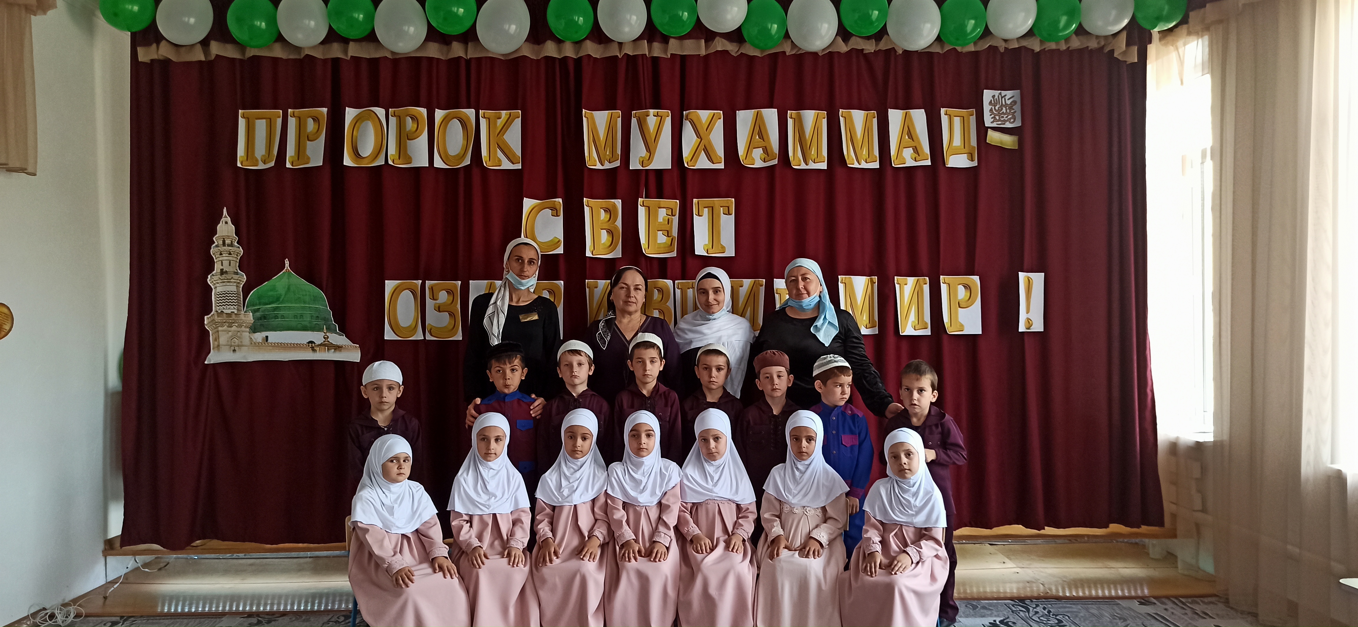 Цель: Развитие духовно-нравственных качеств у детей дошкольного возраста. Иметь представление о религии ислам иметь первоначальное представление о ней. О необходимости знаний об исламе. Развивать устную речь, память, расширять мировоззрение детей и знания.В нашем садике были проведены беседы с детьми посвящённые Дню рождения Пророка Мухаммада (мир ему и благословение). Дети читали стихи, исполняли нашид-восхваления Пророка (мир ему и благословение).Проводя такие мероприятия мы надеемся, что детям это послужит примером духовного воспитания. Фасад детского сада был оформлен баннером, посвященный Дню рождения Пророка Мухаммада (да благословит его Всевышний и приветствует).Также в ДОУ был прочитан Мовлид.