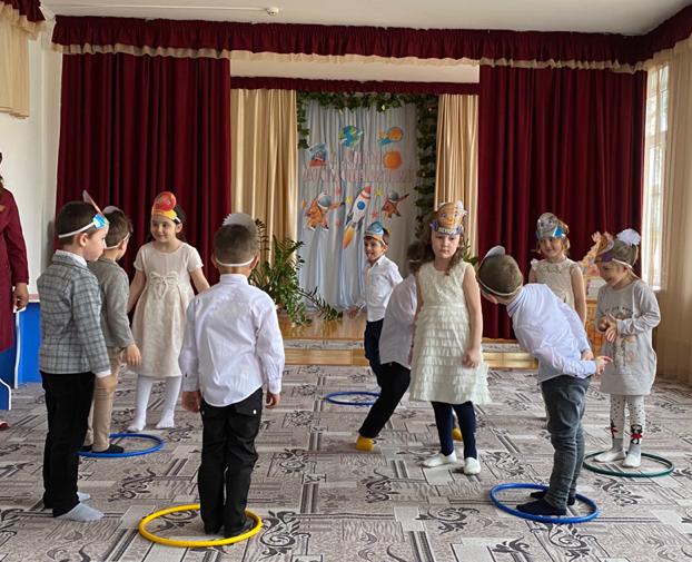 В нашем саду в этот день проводились развлечения «Школа юных космонавтов» в старшей группе «Ромашка», «День космонавтики» в средней группе «Фиалка». Ребята побывали в космосе, ловко отгадали космические загадки, поиграли в веселые подвижные игры, показали свою ловкость и смелость в веселых эстафетах. Добавил веселого задора конкурс «Завтрак космонавта» как в невесомости, ребята пытались выпить сок, без помощи рук, игра «Найди свою ракету», эстафеты и др. Также была организована выставка детских работ на тему «космос».