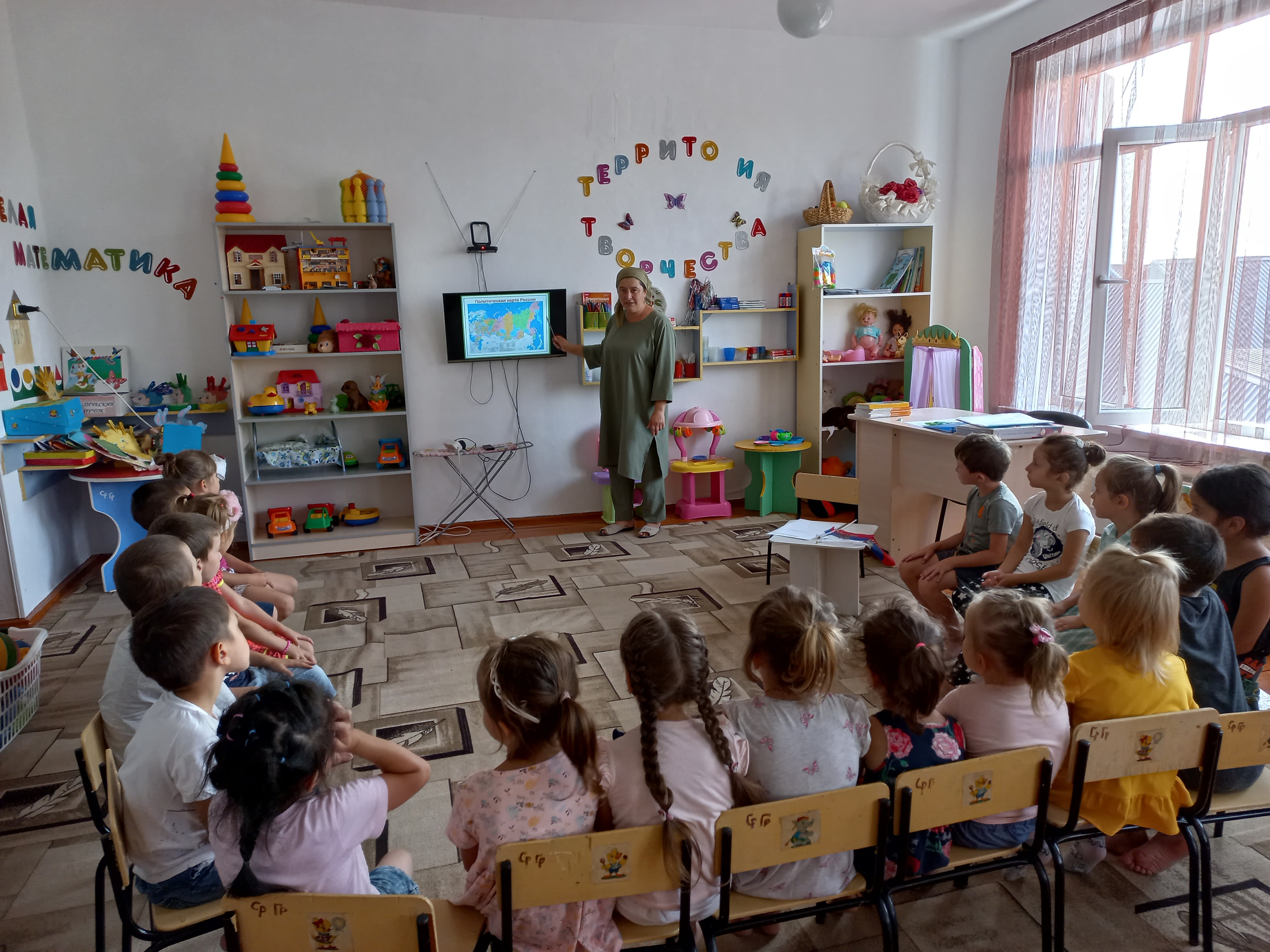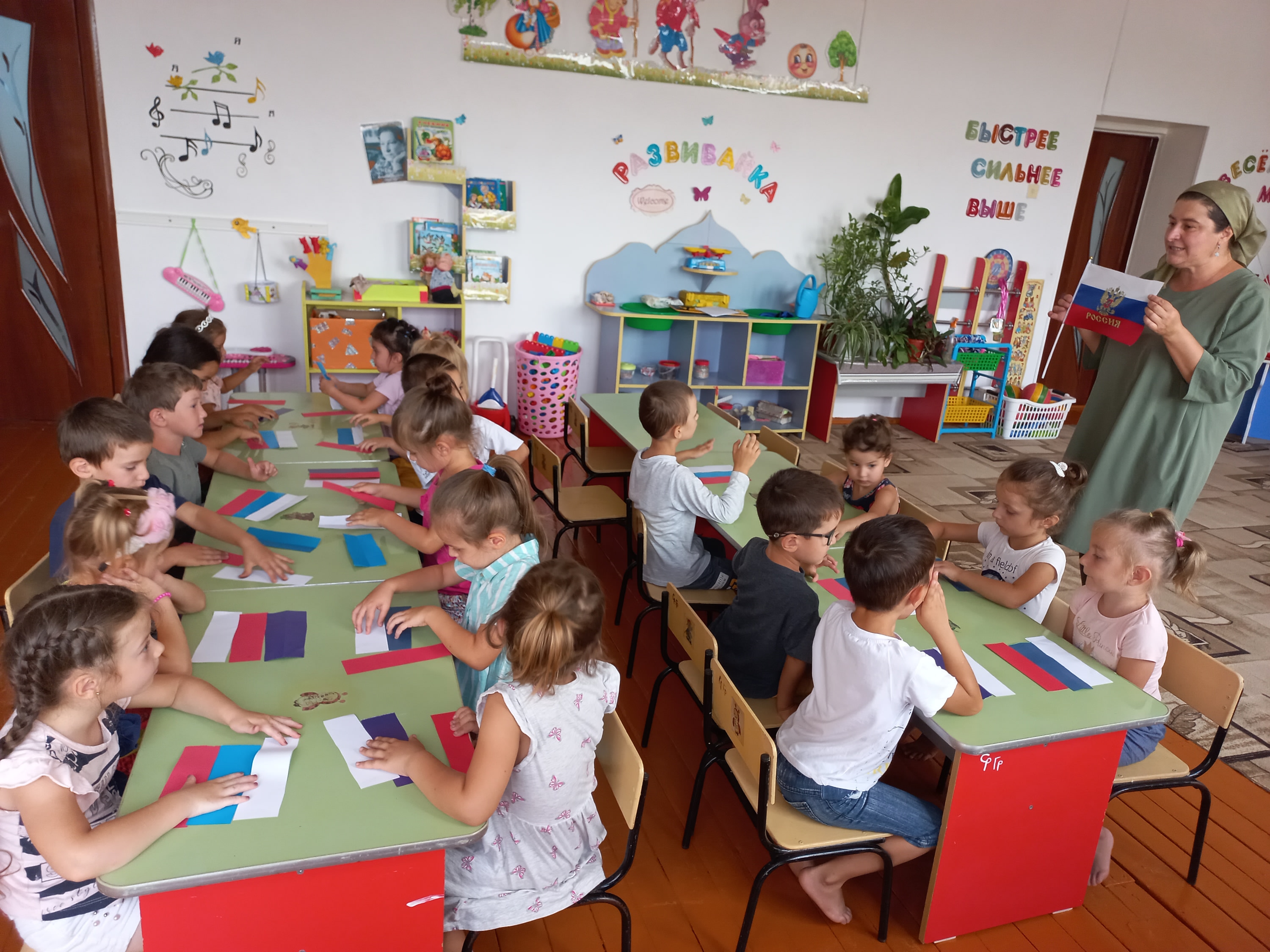 Целью стало расширение представления детей о Государственном флаге Российской Федерации. Способствовать воспитанию патриотизма, уважения к Государственному флагу Российской Федерации. Развивать коллективное и индивидуальное творчество детей. Прозвучал Гимн РФ. Собирали триколор в виде флешмоба: