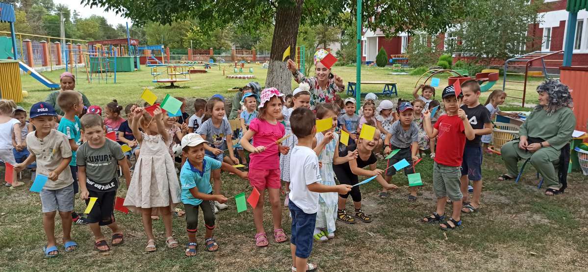 31 августа провели мероприятие «Прощай! Лето красное!». А лето красное не спешило прощаться с малышами, продолжало веселиться. Спели вместе песни, играли в веселые подвижные игры: «Солнышко и дождик», «Если хочется тебе, то сделай так…» и др. Игра «Веселые флажки» очень увлекла детей, где они проявили себя изображая явления природы.