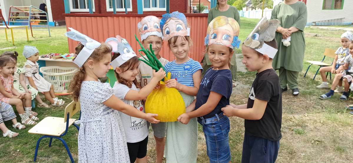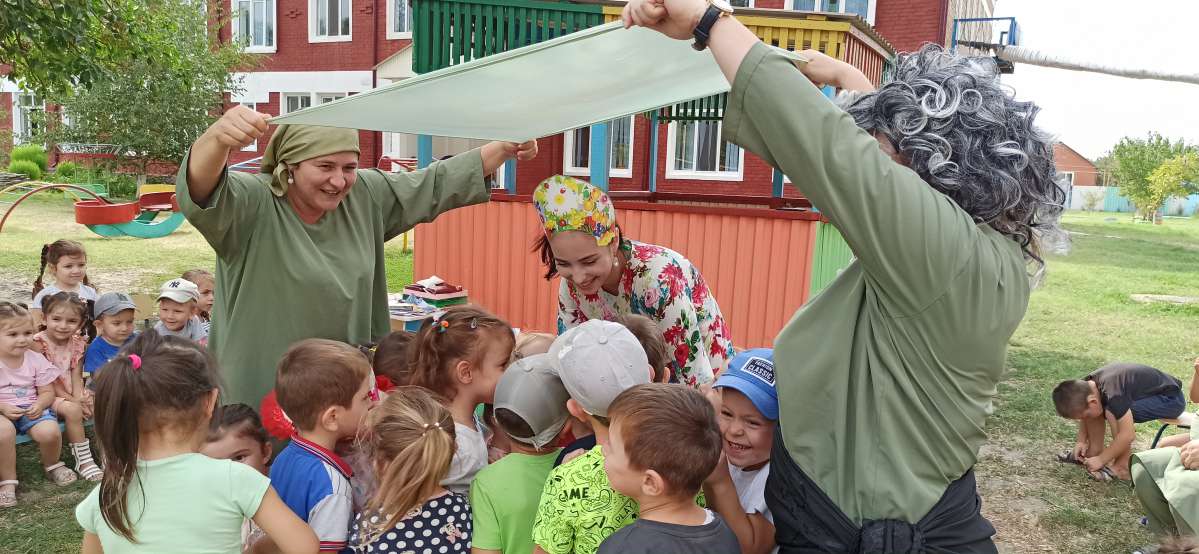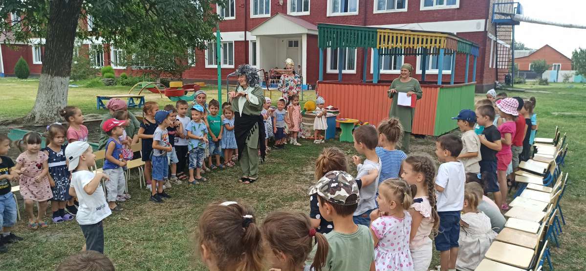 А старшие дошкольники перенеслись в гости к Лету с помощью волшебного цветка, произнося текст: «Лети, лети лепесток…», и оказались то на сказочной полянке, то на спортивной площадке, то на летней площадке. На сказочной поляне дети веселились с Бабой Ягой; а на летней площадке оказались в объятиях Лета. Все сказочные персонажи совместно с детьми танцевали, пели песни. Но пришла пора прощаться, а пока Вам остается, позабыв про все заботы дни прекрасные вспоминать, лета чудесного ждать! «До свидания, лето! Здравствуй осень!»