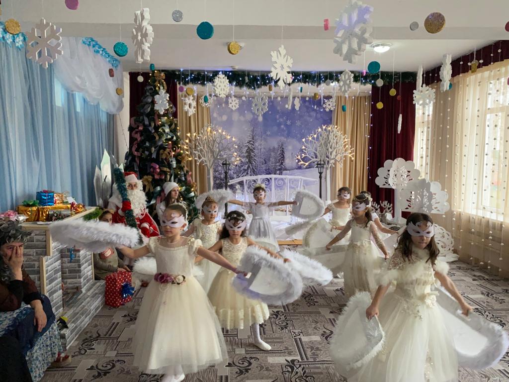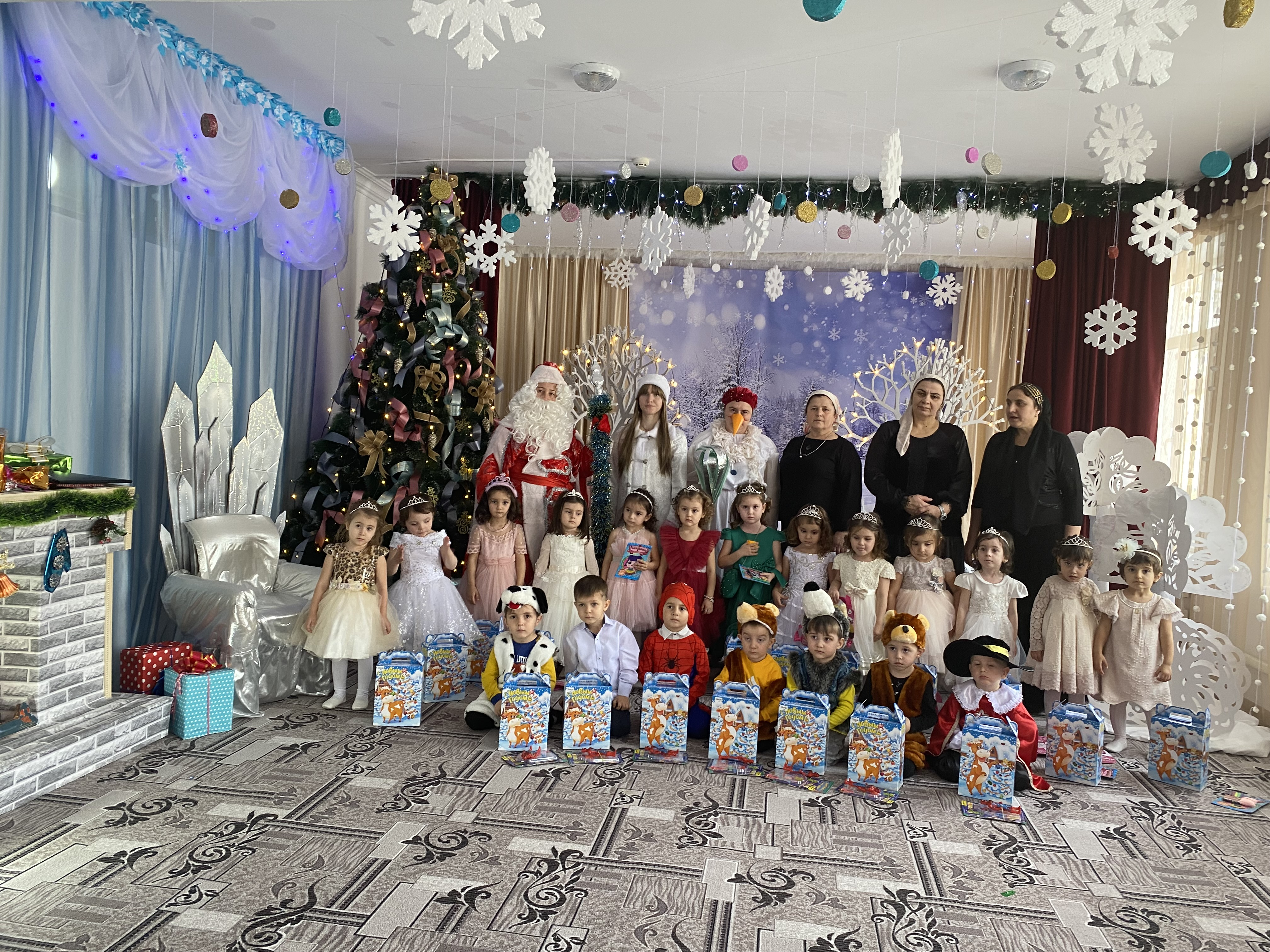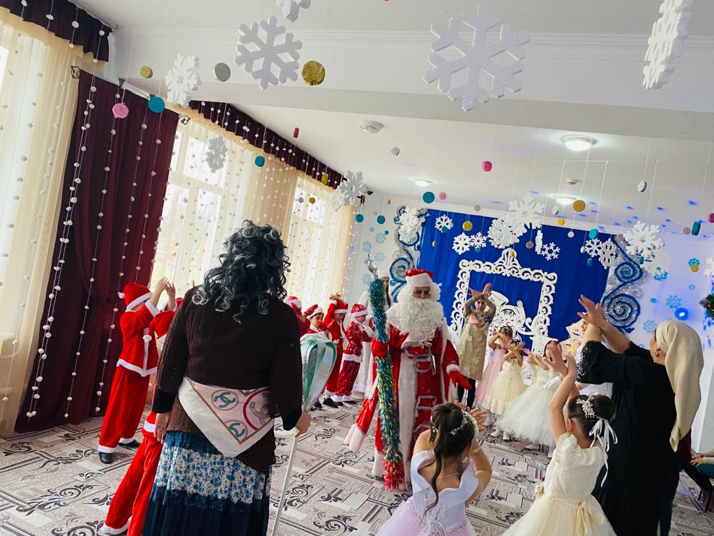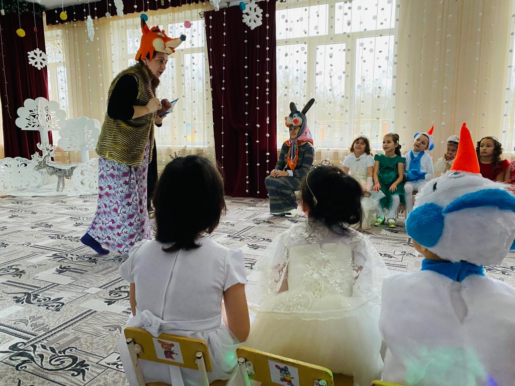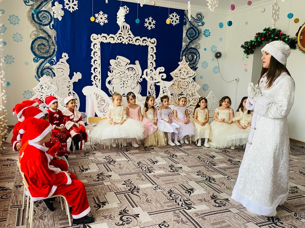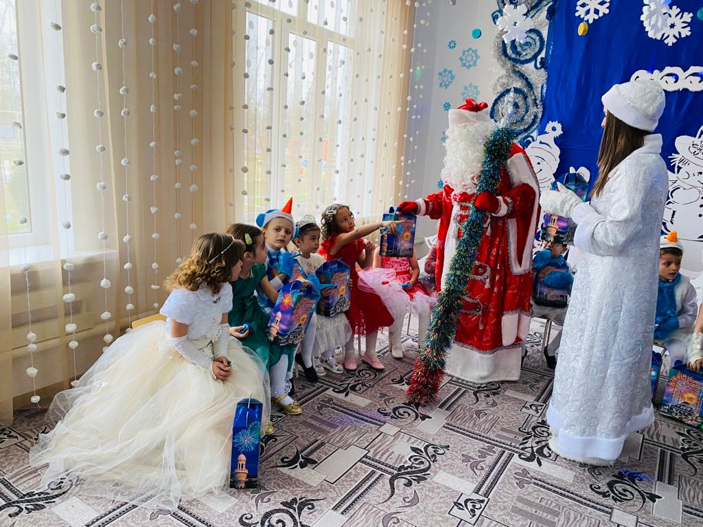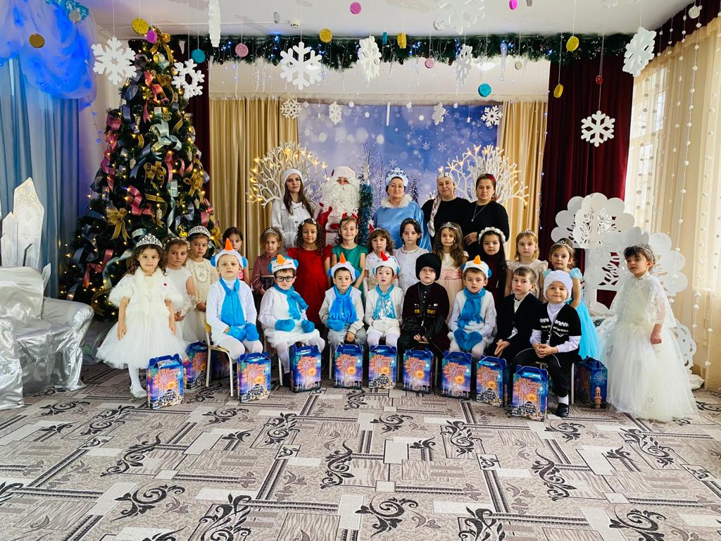 Подготовка началась задолго до наступления праздников. Воспитатели с детьми разучивали стихотворения, рассматривали картины, проводили беседы на тему Нового года, новогодних традиций, разучивали с воспитанниками песни, танцы, новогодние хороводы. Огромную работу провели по оформлению групп, спальной и раздевальной комнат.Вот красавица-зима принесла с собой весёлые долгожданные новогодние праздники, одарила всех подарками! А для наших детей в гостеприимных стенах нашего сада было сказочное представление. Дети пришли на представление нарядные, весёлые в предвкушении праздника. И их надежды оправдались. Воспитатели, дети, помощники воспитателей, участвовавшие в новогоднем представлении, проявили себя хорошими артистами, показав всё своё творческое мастерство, артистизм, задор и организаторские способности. Им пришлось перевоплотиться в разных героев: озорную Бабу Ягу, Емелю, Мешочек, Лису и Зайчика, Снеговика и саму Зиму, щедрого Деда Мороза, доброй Снегурочки. С самого начала представления сказочные герои увлекли детей в волшебный мир сказки. Дети смогли окунуться в праздничную атмосферу приключений, поучаствовать в интересных конкурсах и играх. С появлением Деда Мороза начался настоящий праздник с песнями и танцами, хороводами вокруг ёлки. После представления дети читали стихи Деду Морозу и Снегурочке, фотографировались с персонажами, получали новогодние подарки.Воспитатели выразили огромную благодарность родителям за подготовку новогодних костюмов для детей.