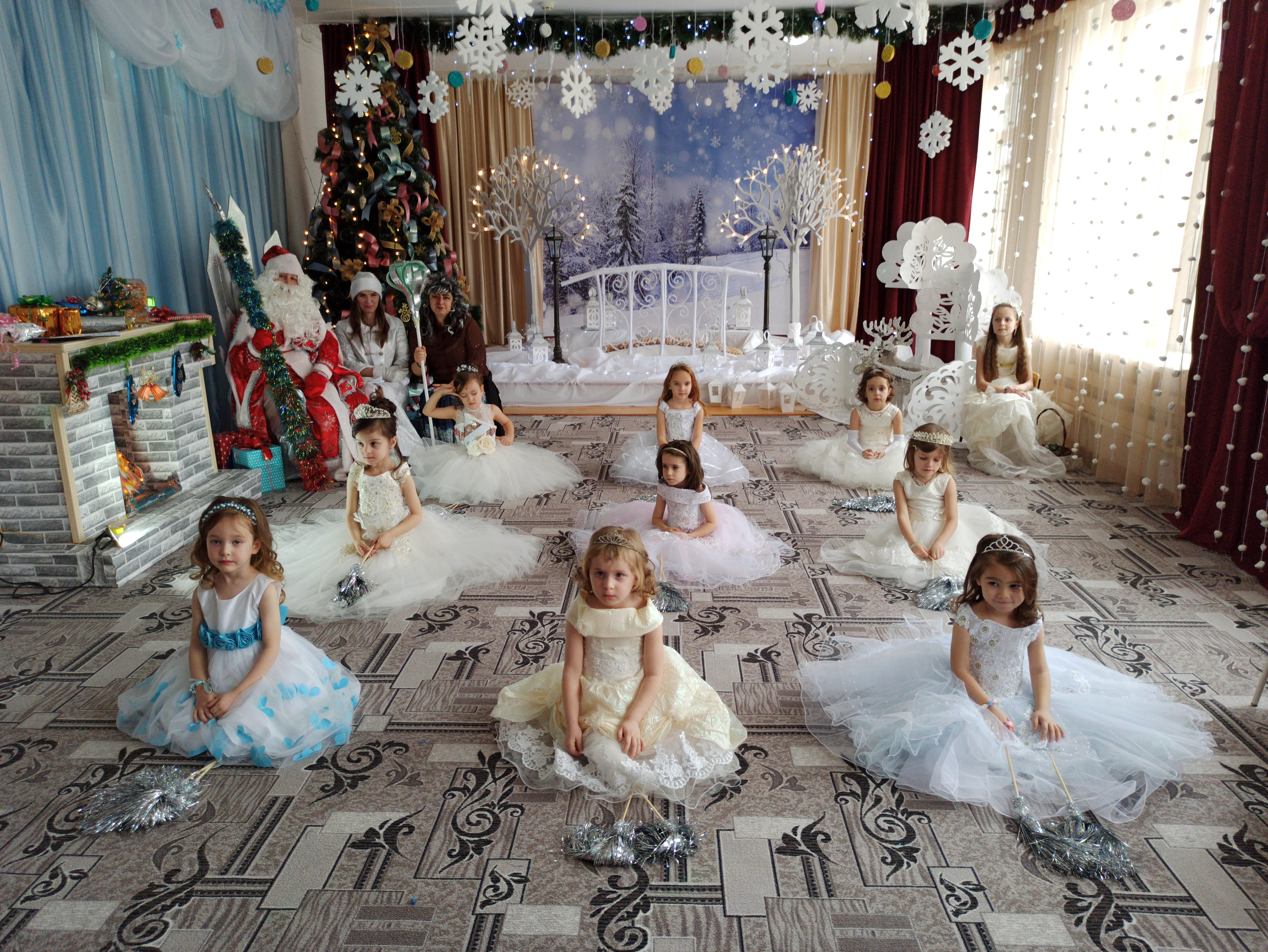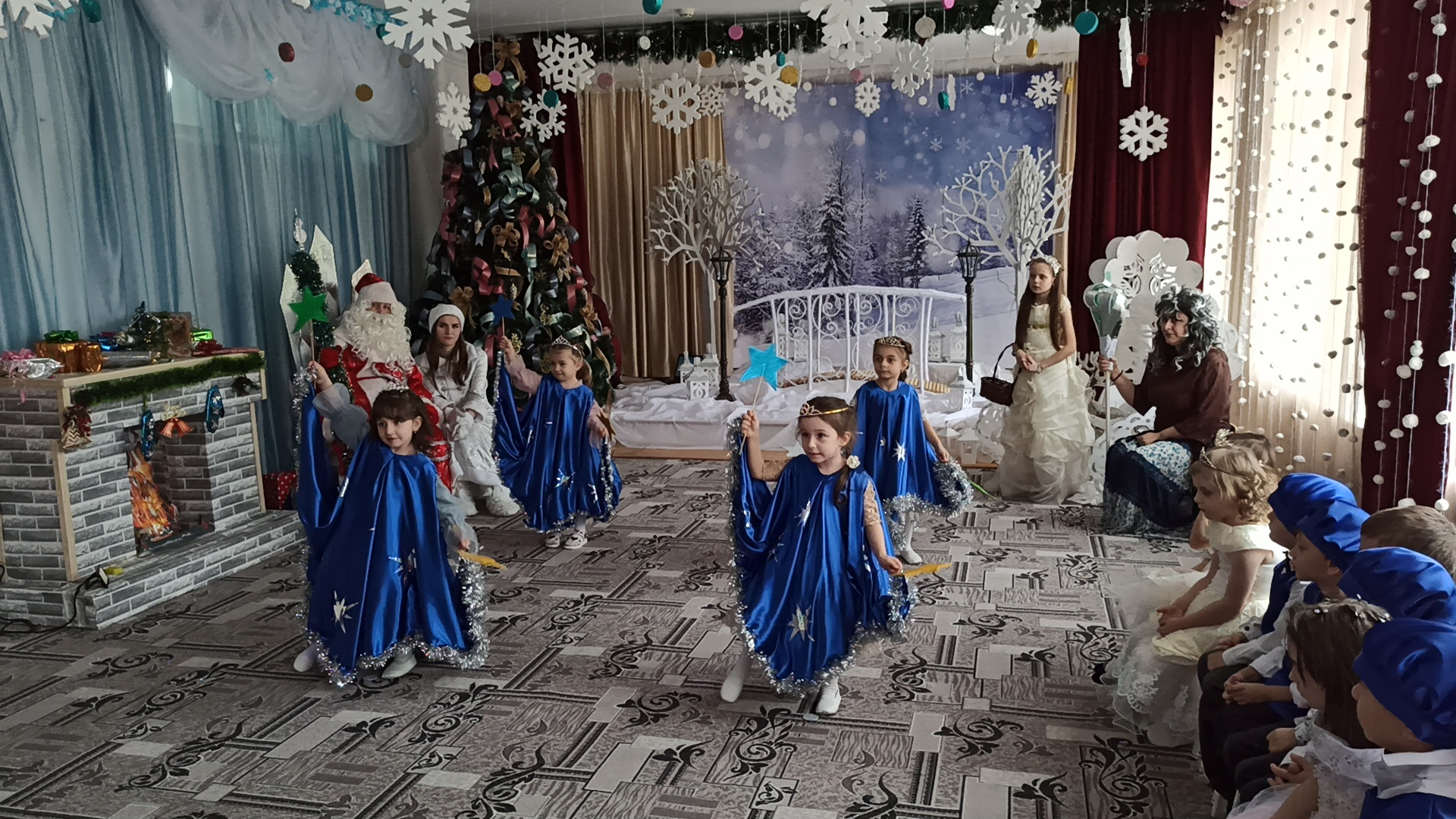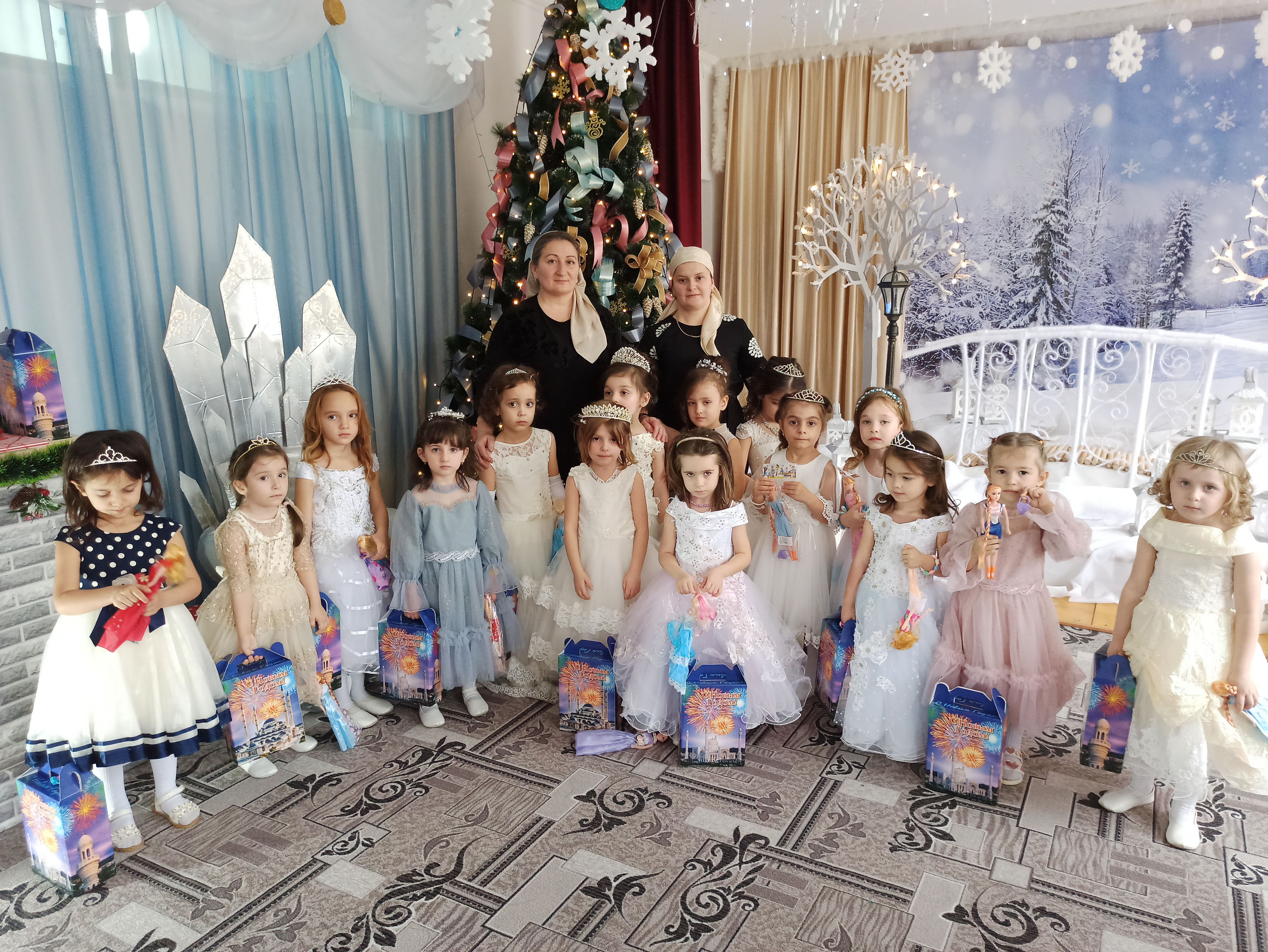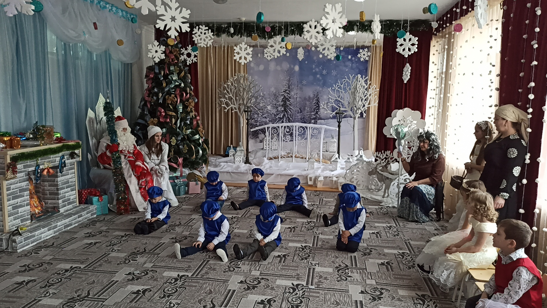 Подготовка началась задолго до наступления праздников. Воспитатели с детьми разучивали стихотворения, рассматривали картины, проводили беседы на тему Нового года, новогодних традиций, разучивали с воспитанниками песни, танцы, новогодние хороводы. Огромную работу провели по оформлению групп, спальной и раздевальной комнат.Вот красавица-зима принесла с собой весёлые долгожданные новогодние праздники, одарила всех подарками! А для наших детей в гостеприимных стенах нашего сада было сказочное представление. Дети пришли на представление нарядные, весёлые в предвкушении праздника. И их надежды оправдались. Воспитатели, дети, помощники воспитателей, участвовавшие в новогоднем представлении, проявили себя хорошими артистами, показав всё своё творческое мастерство, артистизм, задор и организаторские способности. Им пришлось перевоплотиться в разных героев: озорную Бабу Ягу, Емелю, Мешочек, Лису и Зайчика, Снеговика и саму Зиму, щедрого Деда Мороза, доброй Снегурочки. С самого начала представления сказочные герои увлекли детей в волшебный мир сказки. Дети смогли окунуться в праздничную атмосферу приключений, поучаствовать в интересных конкурсах и играх. С появлением Деда Мороза начался настоящий праздник с песнями и танцами, хороводами вокруг ёлки. После представления дети читали стихи Деду Морозу и Снегурочке, фотографировались с персонажами, получали новогодние подарки.Воспитатели выразили огромную благодарность родителям за подготовку новогодних костюмов для детей.