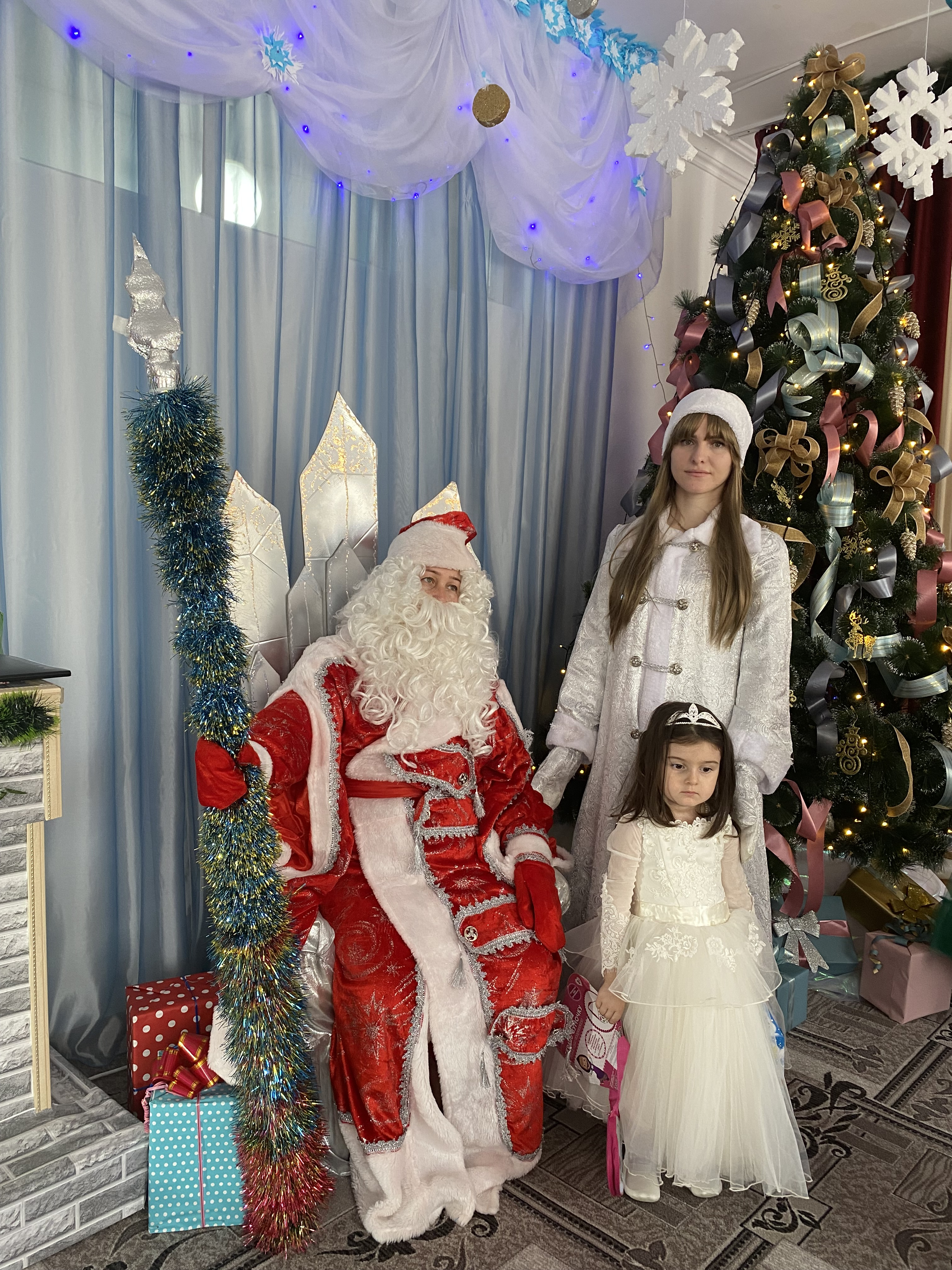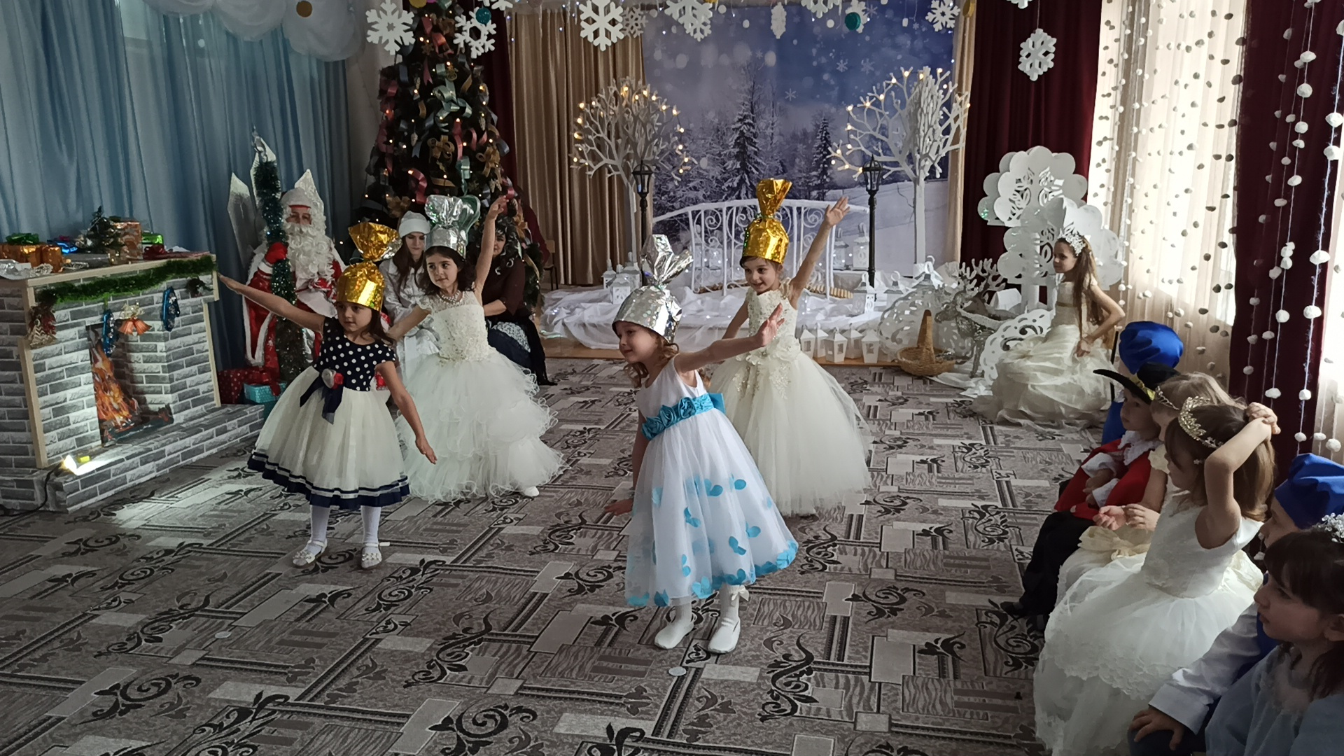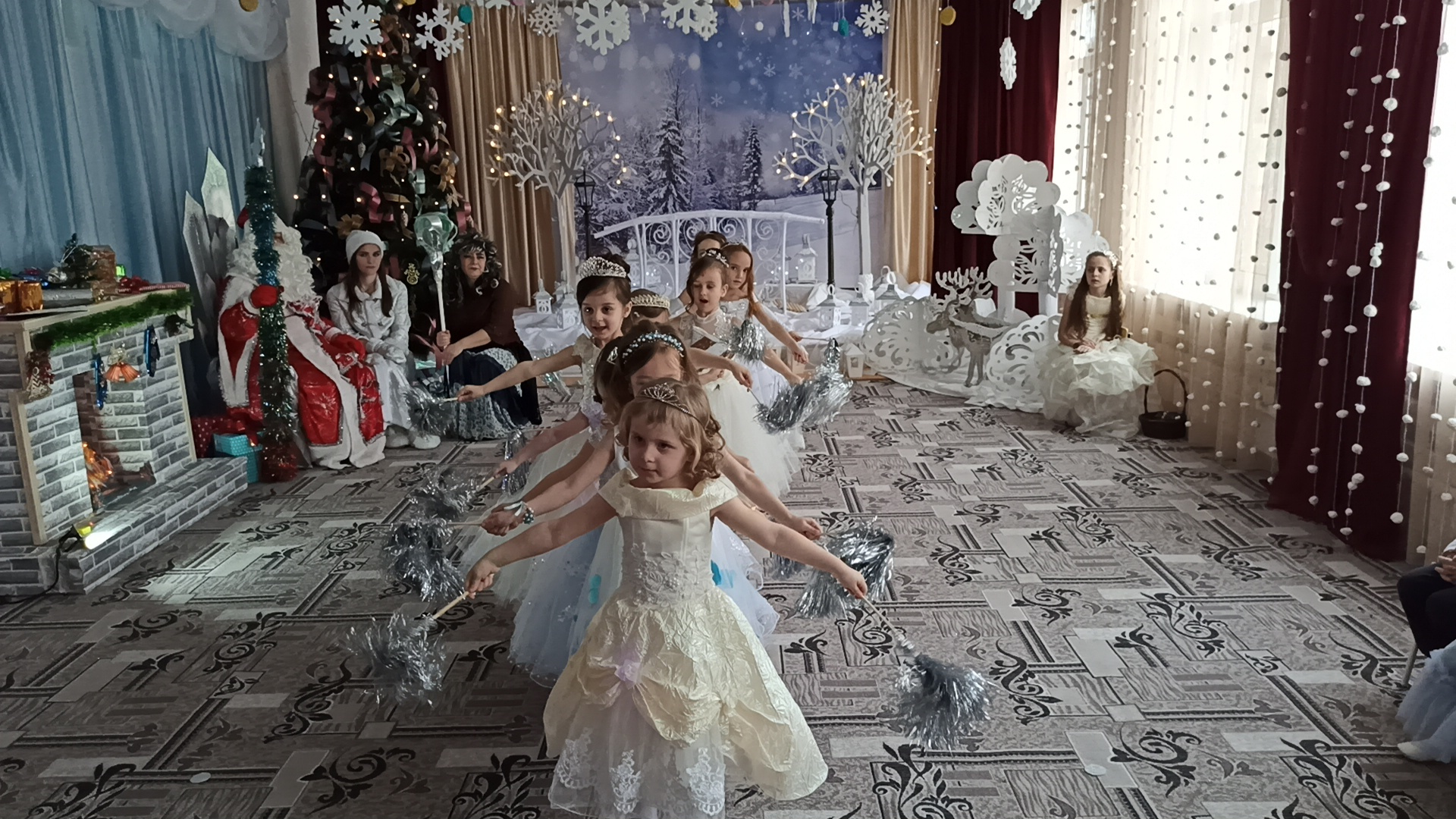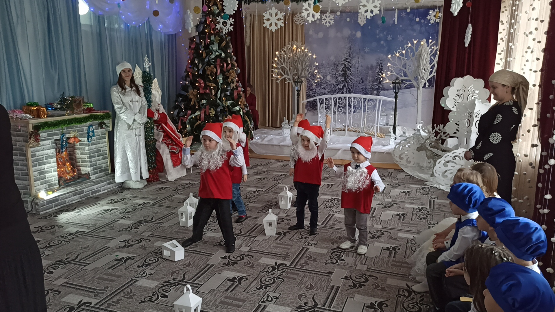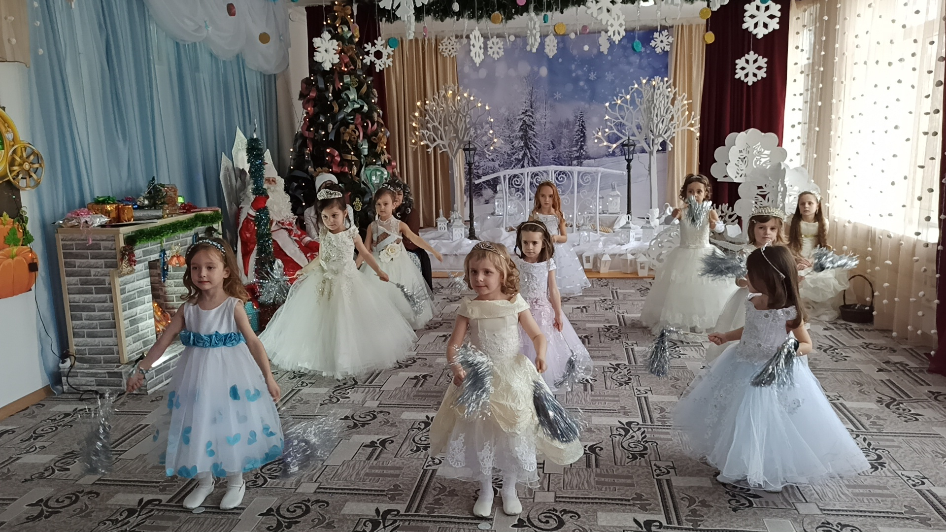 Подготовка началась задолго до наступления праздников. Воспитатели с детьми разучивали стихотворения, рассматривали картины, проводили беседы на тему Нового года, новогодних традиций, разучивали с воспитанниками песни, танцы, новогодние хороводы. Огромную работу провели по оформлению групп, спальной и раздевальной комнат.Вот красавица-зима принесла с собой весёлые долгожданные новогодние праздники, одарила всех подарками! А для наших детей в гостеприимных стенах нашего сада было сказочное представление. Дети пришли на представление нарядные, весёлые в предвкушении праздника. И их надежды оправдались. Воспитатели, дети, помощники воспитателей, участвовавшие в новогоднем представлении, проявили себя хорошими артистами, показав всё своё творческое мастерство, артистизм, задор и организаторские способности. Им пришлось перевоплотиться в разных героев: озорную Бабу Ягу, Емелю, Мешочек, Лису и Зайчика, Снеговика и саму Зиму, щедрого Деда Мороза, доброй Снегурочки. С самого начала представления сказочные герои увлекли детей в волшебный мир сказки. Дети смогли окунуться в праздничную атмосферу приключений, поучаствовать в интересных конкурсах и играх. С появлением Деда Мороза начался настоящий праздник с песнями и танцами, хороводами вокруг ёлки. После представления дети читали стихи Деду Морозу и Снегурочке, фотографировались с персонажами, получали новогодние подарки.Воспитатели выразили огромную благодарность родителям за подготовку новогодних костюмов для детей.