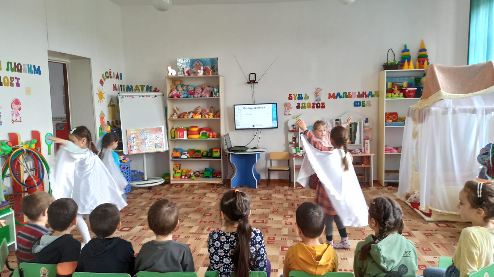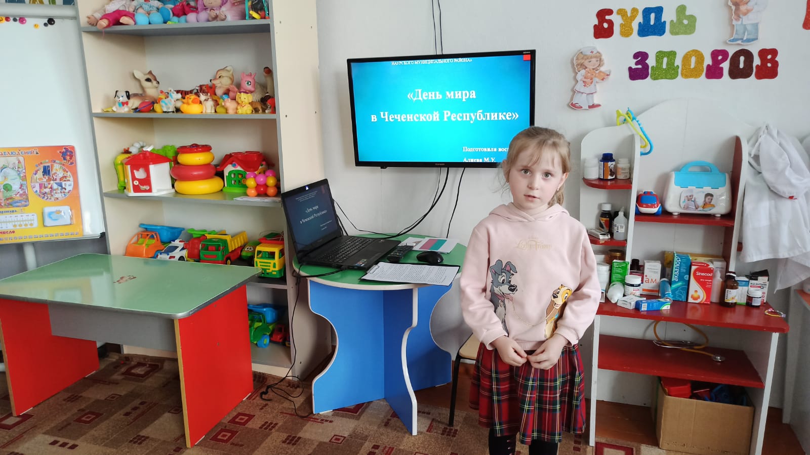 Целью данных мероприятий было: создание атмосферы праздника, привитие любви к малой родине, воспитание уважения к старшим, уважения к традициям, воспитания патриотических чувств, осознания ценности мирного времени. Так в средней группе «Фиалка воспитатель Алиева М.У. организовала развлечение «День мира в Чеченской Республике», также провели тематические беседы в средних группах и в старшей группе «Ромашка», во всех возрастных группах для родителей были оформлены папки-передвижки «Чеченская Республика-война и мир!».